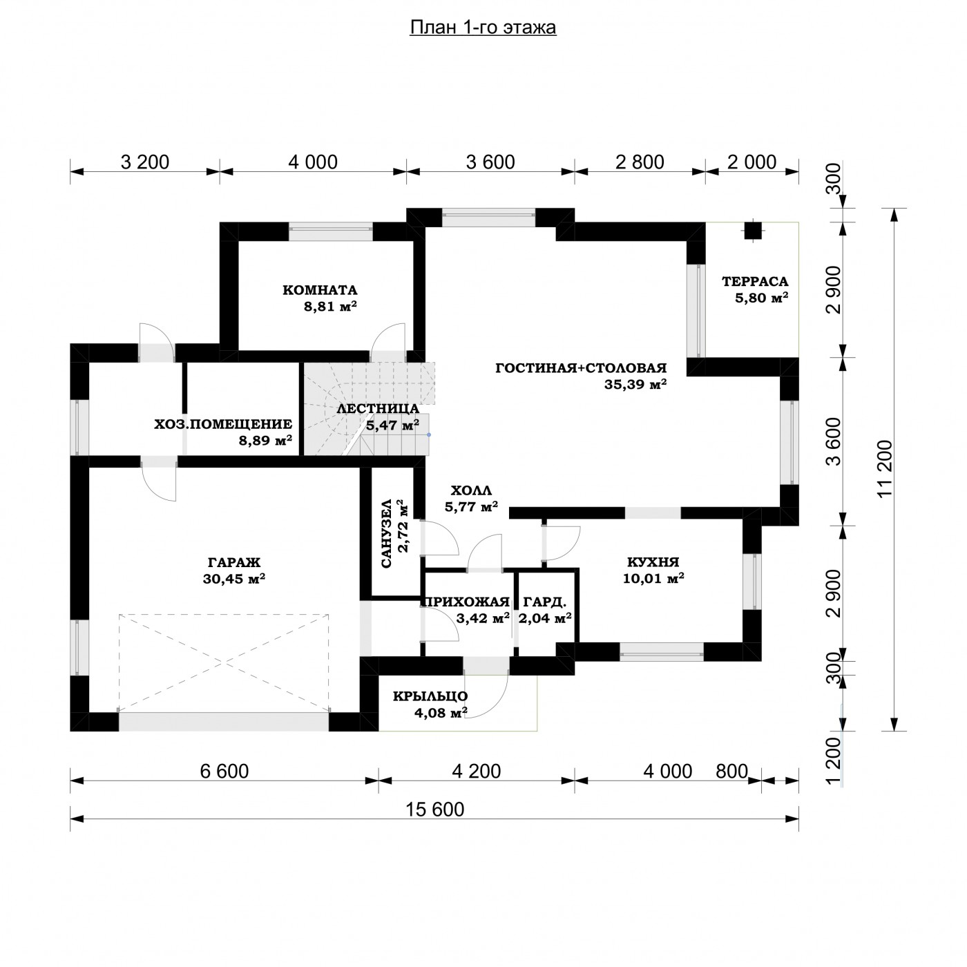1 этаж 1 прихожая 3,1 м² 2 гардеробная 1,77 м² 3 кухня 9,78 м² 4 гостиная + столовая 36,94 м² 5 комната 8,82 м² 6 лестница 4,36 м² 7 холл 2,43 м² 8 санузел 2,61 м² 9 гараж 28,95 м² 10 хоз.помещение 7,69 м² 11 терраса 17,5 м² Всего 106,45 м² |