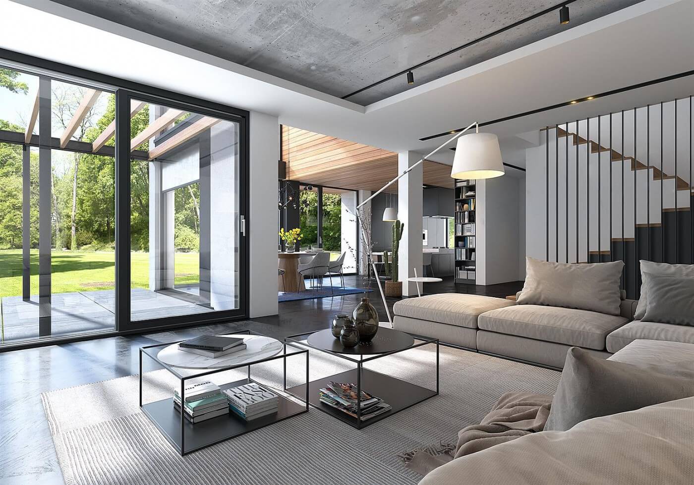 Открытого плана 2-х этажный дом с просторным гаражом, с плоской крышей, с террасой, имеющай габаритные размеры по проекту 16 на 21.